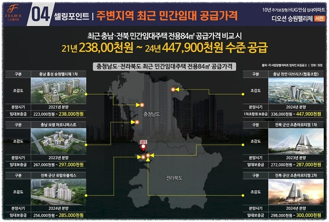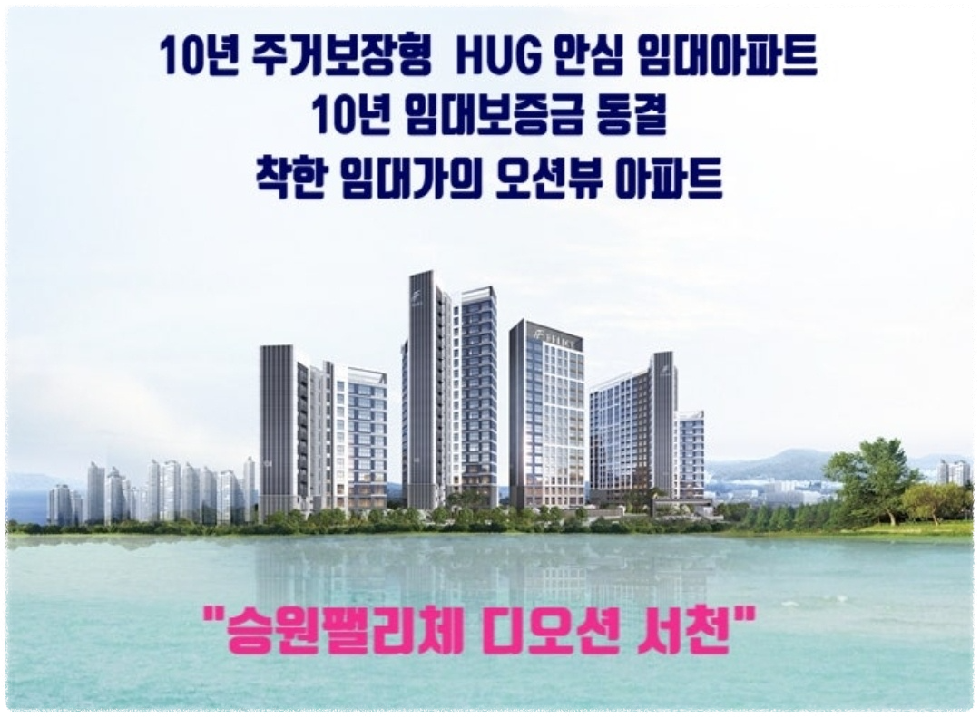 '디오션 승원팰리체 서천' 민간임대 아파트는 나라에서 보증해 주는 주택도시보증공사(HUG) 발급으로 안정적인 거주를 할 수 있는 10년 전세 아파트로, 군산과 서천의 더블 생활권을 동시에 누릴 수 있는 전략적 입지와 더불어 확 트인 오션뷰와 스마트한 생활 제공으로 편리한 생활을 누릴 수 있습니다.