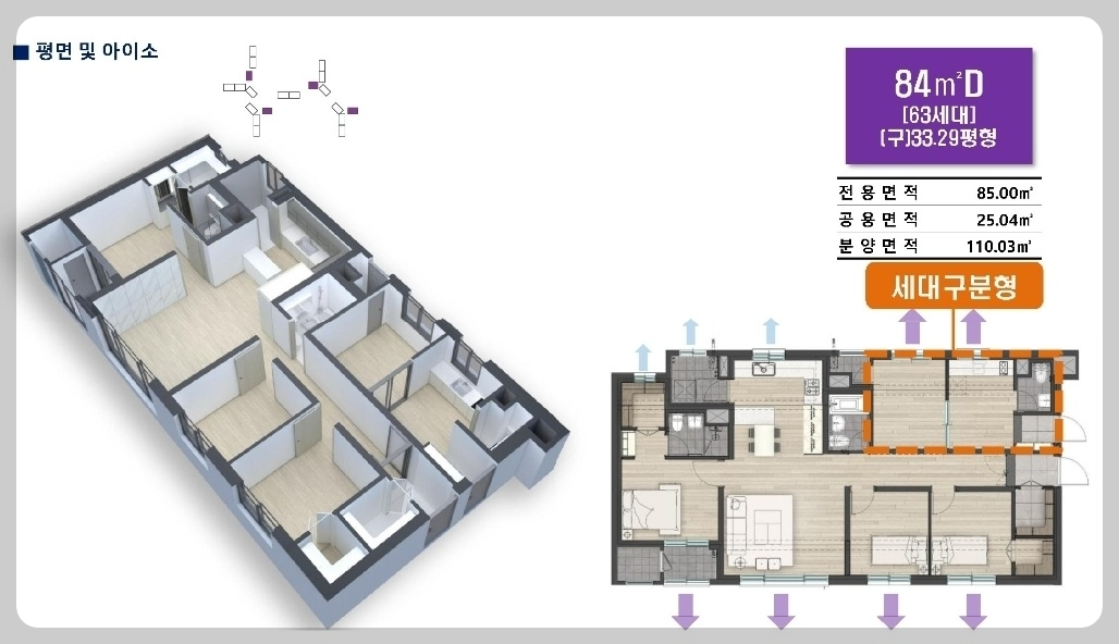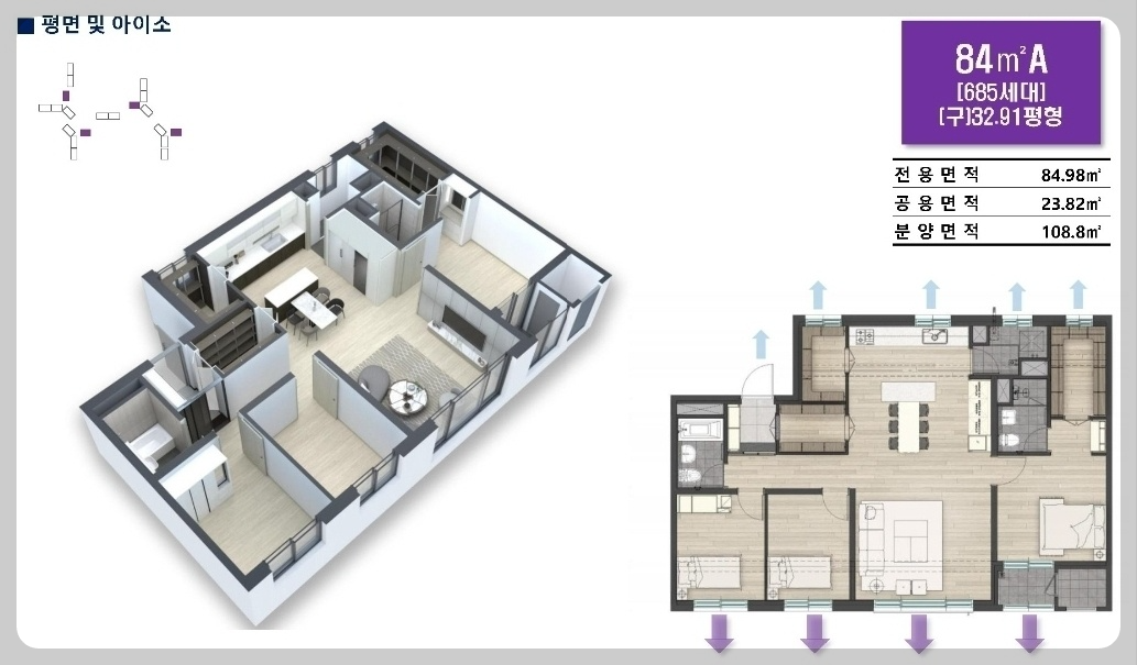 침실 3개, 욕실 2개, 현관과 주방 순환동선 팬트리,